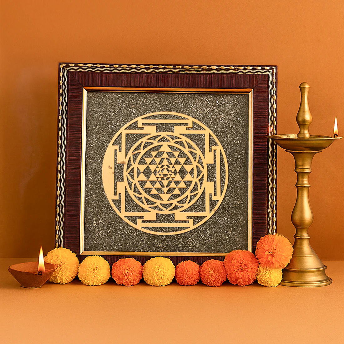 The Shri Yantra with pyrite frame is a sacred spiritual symbol believed to attract wealth, prosperity, and positive energy, bringing the divine blessings of Goddess Lakshmi.